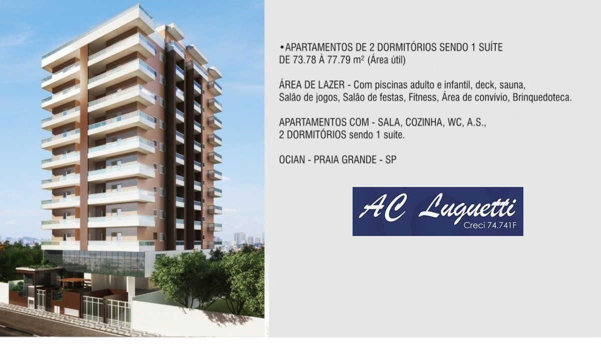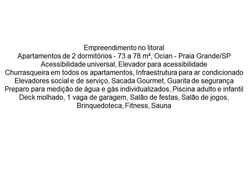 Apartamentos de 2 dormitórios - 78 m², Mirim - Praia Grande/SP, Empreendimento no litoral, Acessibilidade universal, Elevador para acessibilidade, Churrasqueira em todos os apartamentos, Infraestrutura para ar condicionado, Elevadores social e de serviço, Sacada Gourmet, Guarita de segurança, Preparo para medição de água e gás individualizados, Piscina adulto e infantil, Deck molhado, 1 vaga de garagem, Salão de festas, Salão de jogos, Brinquedoteca, Fitness, Sauna. Tratar: Antonio Carlos Luguetti CRECI 74.741-F. Vivo & Whatsapp (13) 99654 6427, Tim (13) 98176 2616. Visite nosso site www.aclcorretor.com.br, e-mail acluguetti@yahoo.com.br Cadastre seu imóvel para venda ou locação. Entre em contato pelo whatsapp. Entrada R$ 35.000,00 CHAVES R$ 60.000,00 15 ANUAIS R$ 3.000,00 180 PARC. R$ 1.999,32 TOTAL R$ 499.877,60Transação: Venda